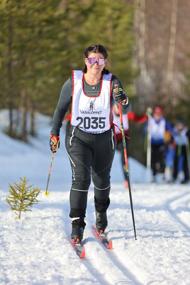 Die Solonummer: Erst seit zehn Jahren steht Karin Kahle überhaupt auf Langlaufbrettern, vorher war sie nur als Betreuerin der Kinder dabei. Die hörten auf, sie startete durch und bestreitet seit 2022 auch Wettkämpfe. „Ich wollte nicht mehr nur warten, bis alle ins Ziel kommen“, sagt die 48-Jährige und fügt mit sympathischer Selbstironie hinzu: „Nun warten sie auf mich.“ Beim Wasalauf, für den sie ihr Mann angemeldet und sie damit quasi zu ihrem Glück gezwungen hat, waren 4:20:48 Stunden in ihrem ersten 45-Kilometer-Rennen aber sehr respektabel. Die doppelte Distanz traue sie sich noch nicht zu, erklärt Karin Kahle, warum sie im Rahmen der Wasalauf-Woche bereits einige Tage vor ihren Mitstreitern in einem offenen Lauf ohne Platzierungen mitmischte.